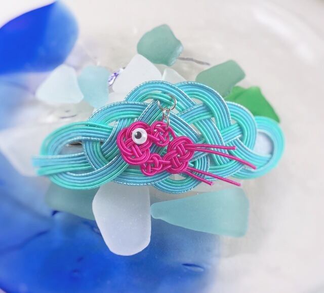 爽やかなアクアカラー水引の上に、濃いピンク色の金魚がゆらゆらと揺れるキュートなバレッタです。