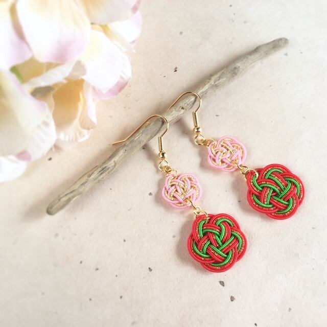 赤とピンクの美しい水引で作った、小さなお花のピアスです。
