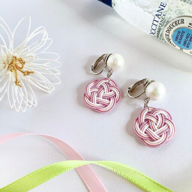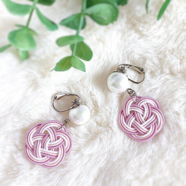 【紫雲】水引 お花とコットンパール イヤリング 藤色 パープル ゆらゆら