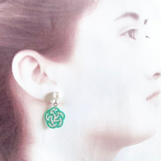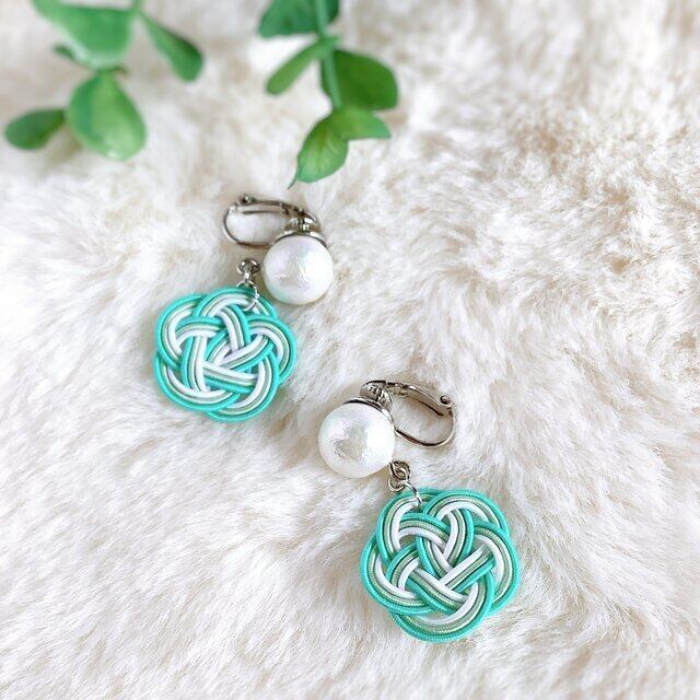 【五月待つ】水引 お花とコットンパール イヤリング 薄荷 ミント ゆらゆら