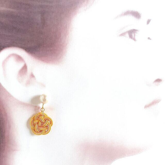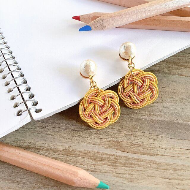 【山吹】水引 お花とコットンパール イヤリング 黄色 和風 ゆらゆら
