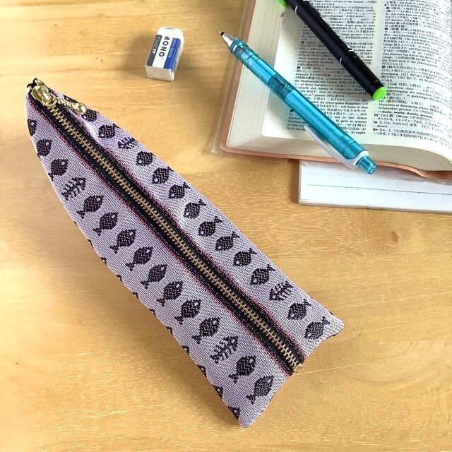 お魚と魚の骨柄の畳縁で作ったポーチです。
