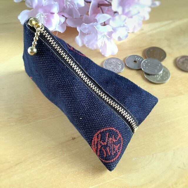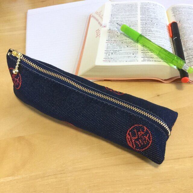 「元気」の文字が躍る、デニム風の畳のヘリで作ったペンケースです。