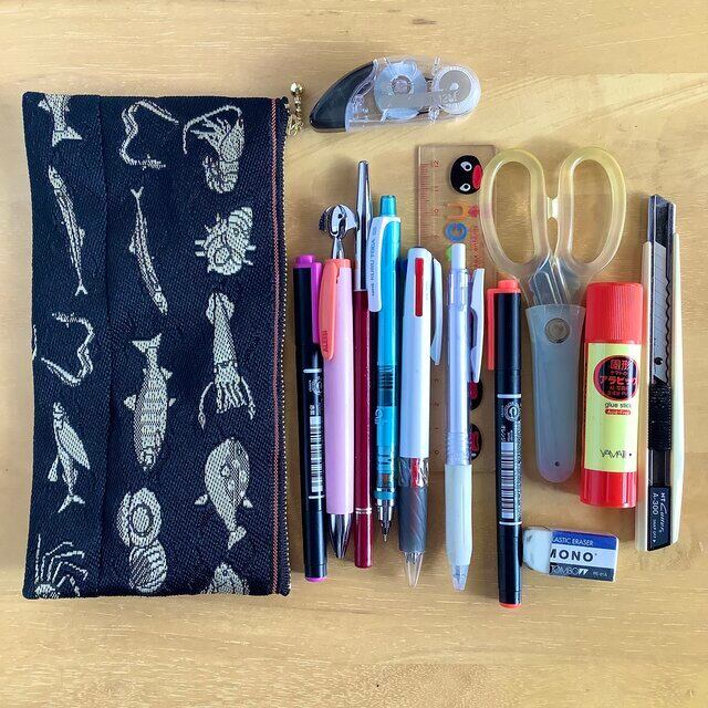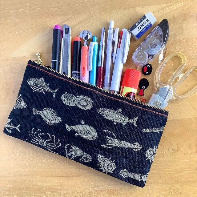 【魚介】畳縁 マスクケース 幅広ペンケース ポーチ 和風 黒 魚