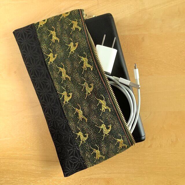 そんな馬柄と、透け感がある黒地の麻の葉模様の畳縁を継いで作ったポーチです。