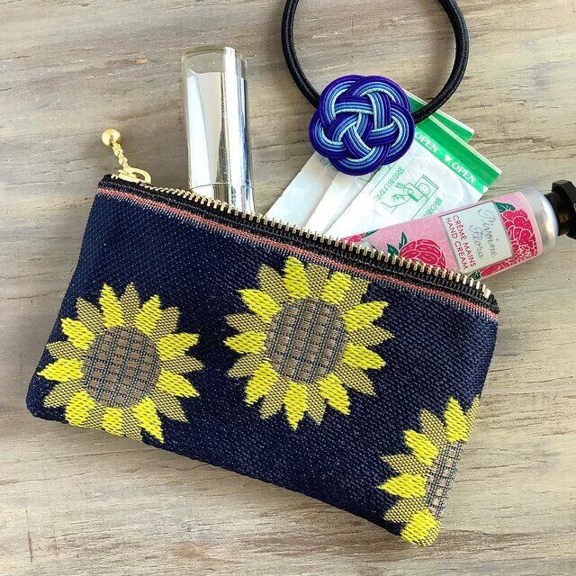誰もが大好きなヒマワリ柄の畳のヘリで作ったミニポーチです。