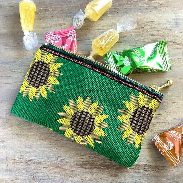 誰もが大好きなヒマワリ柄の畳のヘリで作ったミニポーチです。