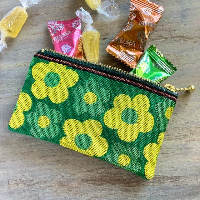 レトロでポップな明るい花柄の畳縁で作ったミニポーチです。