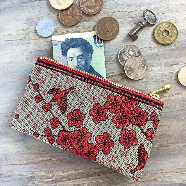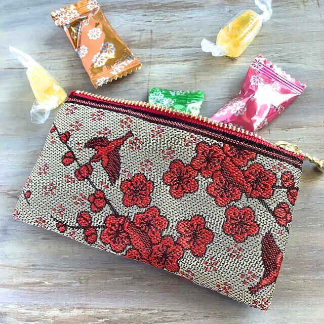 金地の上に、赤い梅と鶯が映える華やかなイメージのミニポーチです。