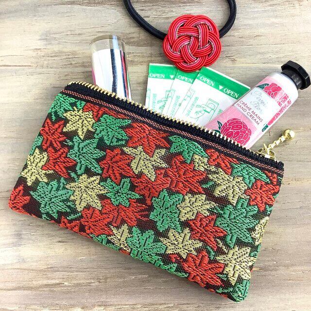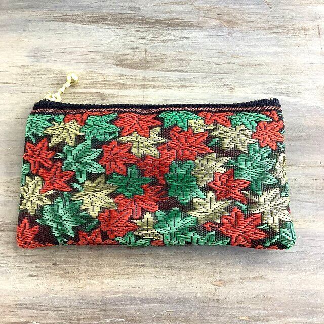 紅葉で埋め尽くされた畳のヘリで作ったミニポーチです。