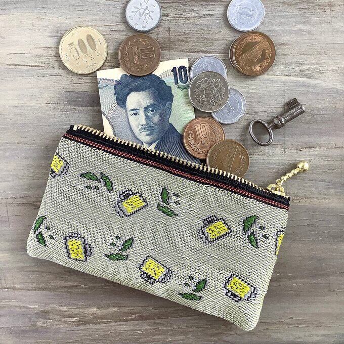 枝豆とビール柄が織り込まれたユニークな畳縁で作ったミニポーチです。