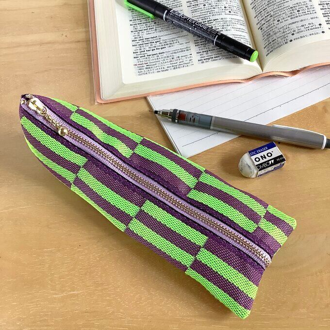 紫と蛍光グリーンの段違い縞模様の畳縁で作ったペンケースです。