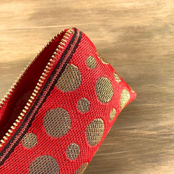 華やかな赤地に、ゴールドの水玉がキラキラと輝く