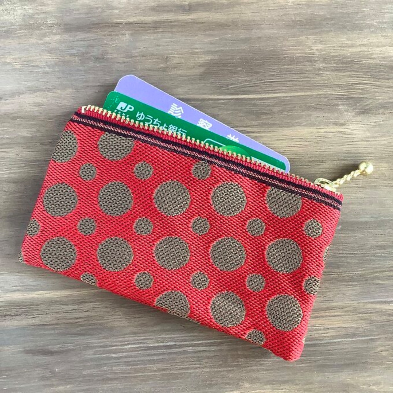 華やかな赤地に、ゴールドの水玉がキラキラと輝く