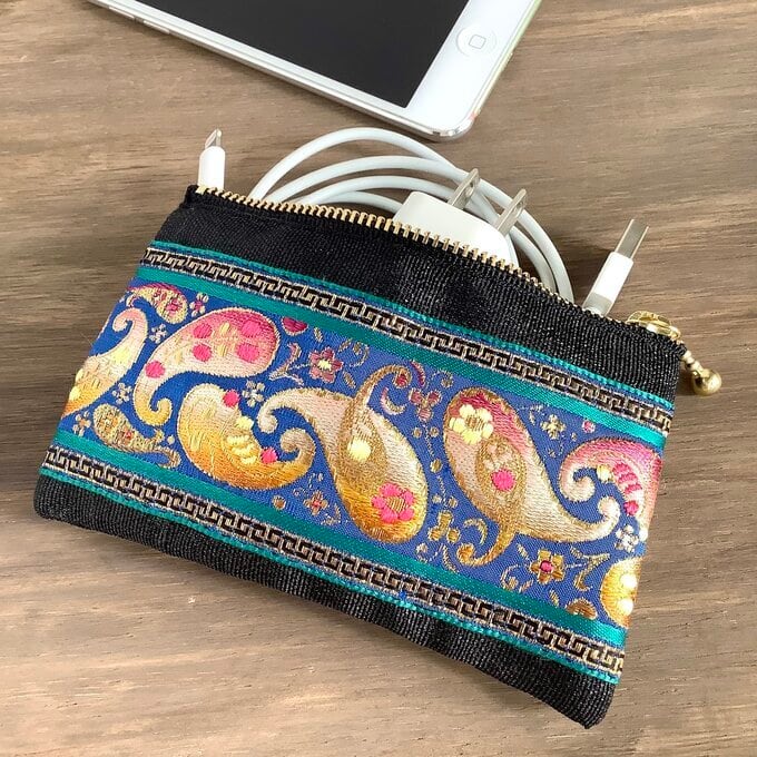 畳の縁を丁寧に手縫いで縫い合わせた、個性的なポーチです。