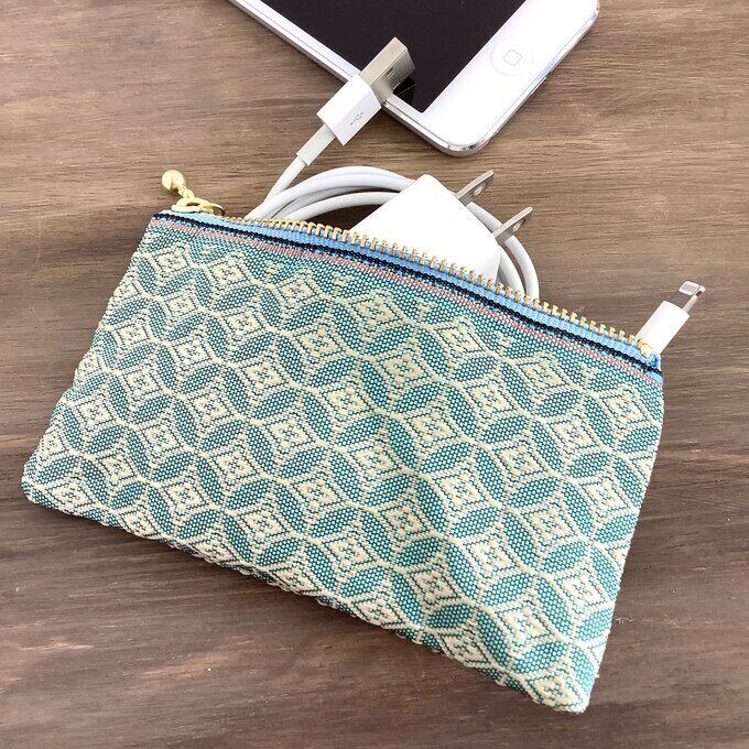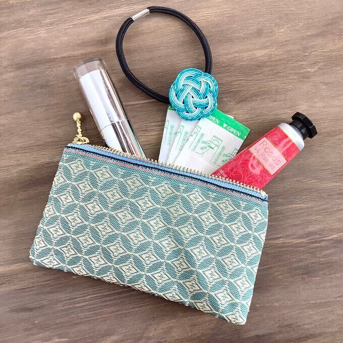 畳縁としては珍しい?薄藍色に、七宝文様が織り込まれたミニポーチです。
