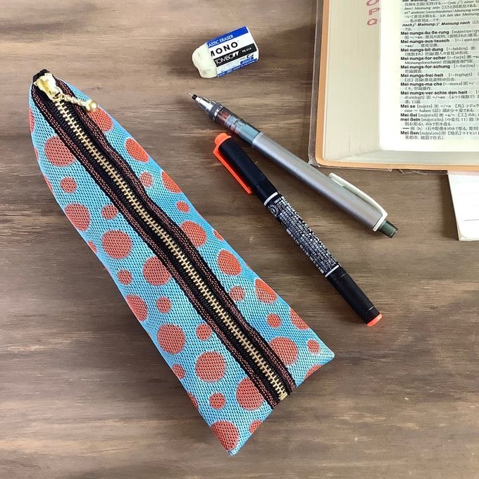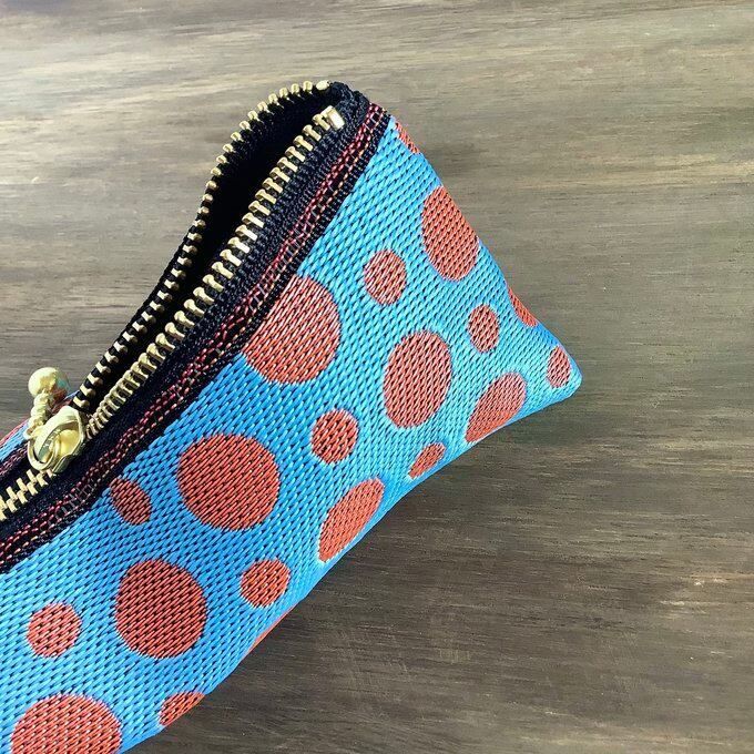空色(水色)にオレンジ色の水玉柄の畳縁で作ったペンケースです。