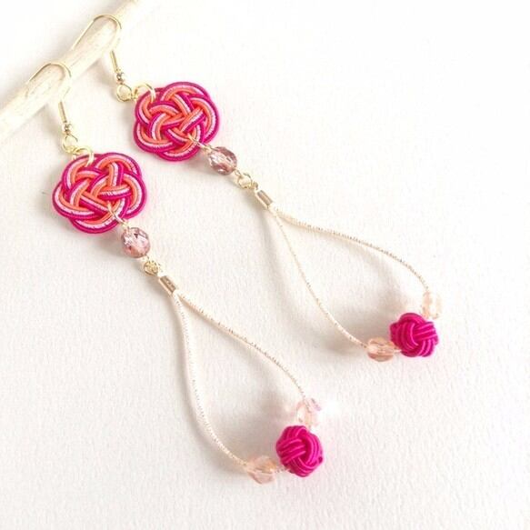 アザレアの濃いピンク色の水引で作った大人っぽいピアスです。